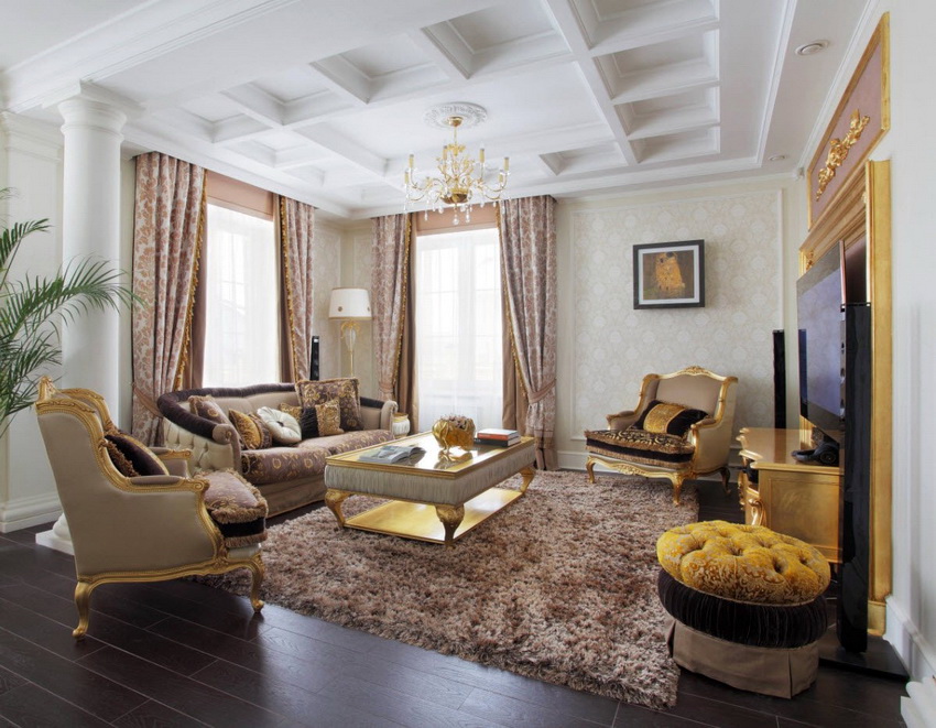 Un interior clásico es fácil de recrear tanto en una sala de estar espaciosa como en una pequeña. Las paredes de la habitación están decoradas con colores claros y se pueden complementar con reflejos dorados y de nácar. La mejor solución es un papel costoso o un papel tapiz textil con un patrón sofisticado. Los paneles de pared de la sala de estar a menudo están decorados con yeso decorativo con elementos de pintura artística.Al mismo tiempo, la superficie del techo se hace mate, sombreando las paredes.