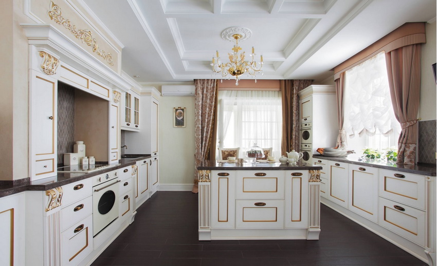 Se prefieren materiales resistentes a la humedad y de limpieza rápida como piso para interiores de cocinas clásicas. Puede ser parquet natural revestido con una capa de barniz hidrófugo, piedra artificial, baldosas cerámicas, gres porcelánico o moqueta de corcho. El techo de una cocina clásica debe ser blanco. Si la altura de la habitación es más de 2,8 m, se puede complementar con molduras de estuco volumétricas características y dorado.