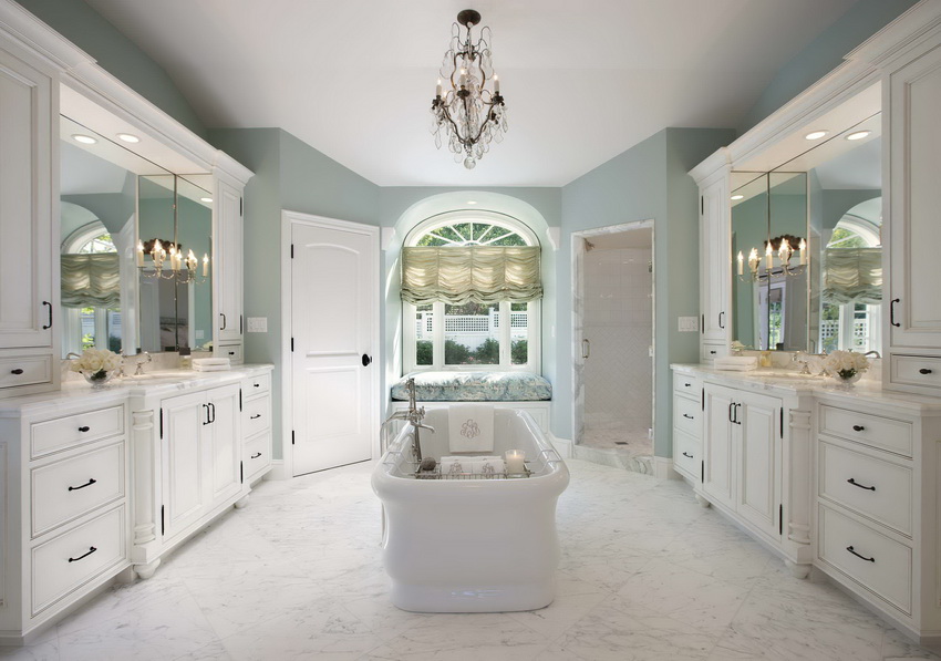 El techo en el diseño interior de los clásicos a menudo está representado por un lienzo blanco de un solo color con molduras de estuco estampadas. Además, se puede realizar en turquesa, rosa pálido, celeste o color carne con el añadido de cenefas, viñetas de estuco o cornisas. Para crear una imagen única, se decora con pintura estampada o frescos temáticos.