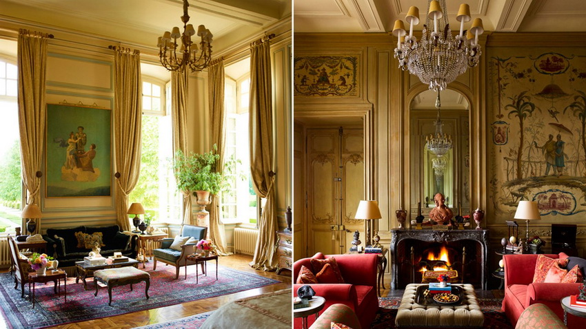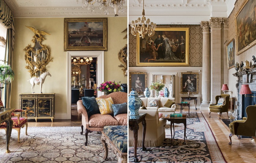 Lienzos de cuadros en marcos antiguos, libros antiguos con tejidos de terciopelo u oro, relojes de pie de madera natural, juegos de porcelana, accesorios de iluminación de cristal de forma proporcional, lámparas de pie con pantalla de tela, espejos con marco dorado, bronce caro figurillas, jarrones y candelabros de plata.