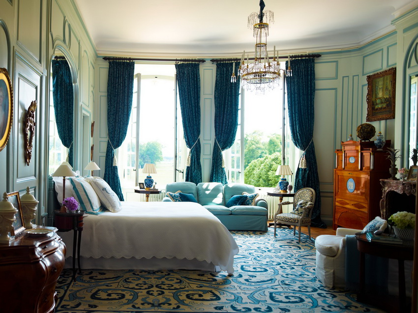 La pieza central del dormitorio es una enorme cama doble de madera con un cabecero tallado tapizado en terciopelo o cuero. Hay modelos decorados con elementos forjados, dorados, para los que es característica la incrustación con piedras semipreciosas. El diseño a menudo se complementa con un dosel para mejorar el efecto de lujo.