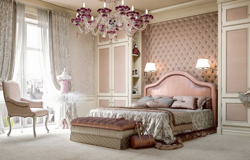El dormitorio de estilo clásico combina muchos detalles espectaculares, expresivos y originales, gracias a los cuales se crea la imagen de un interior rico, lujoso y cómodo.