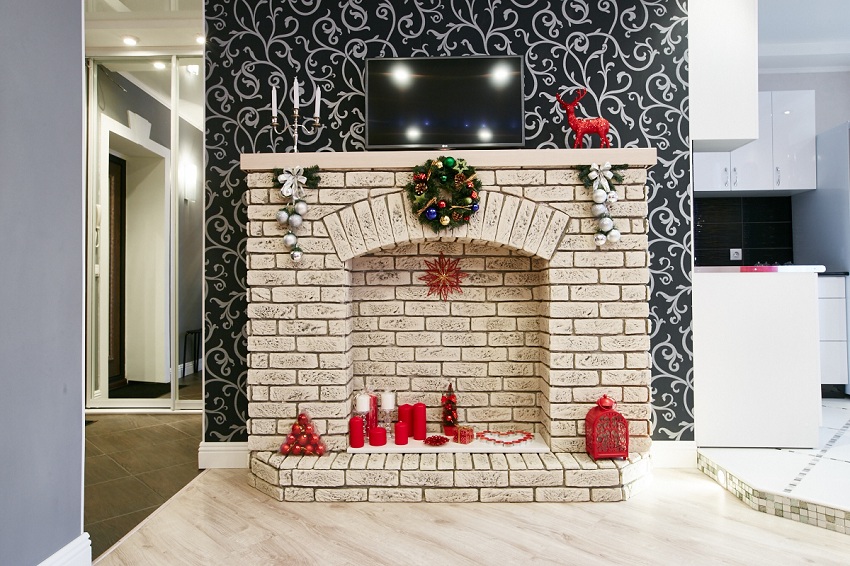 Una chimenea de ladrillos decorativos no necesita un acabado adicional. Este material en sí parece muy original. Los estantes de madera y los troncos reales son adecuados para decorar este tipo de estructura. Un ambiente romántico especial reinará en el apartamento cuando se construya una falsa chimenea de ladrillo con velas.