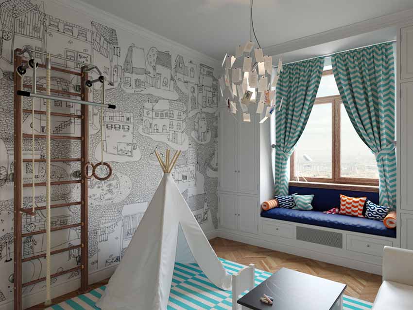 Diseño de papel tapiz para una guardería para un niño: foto de interiores.