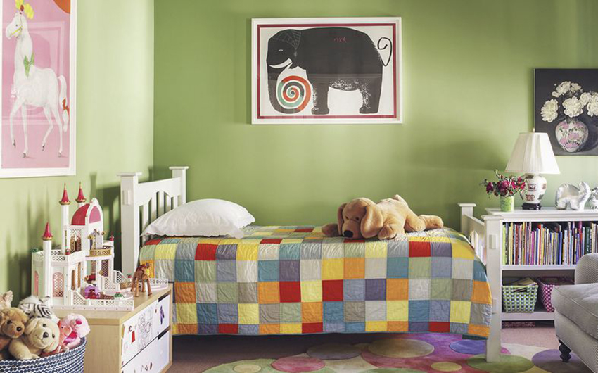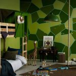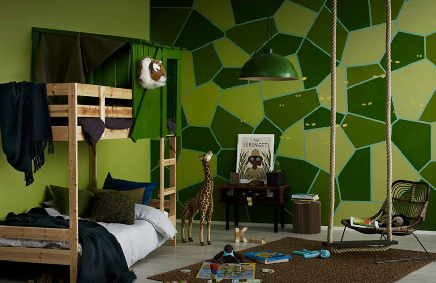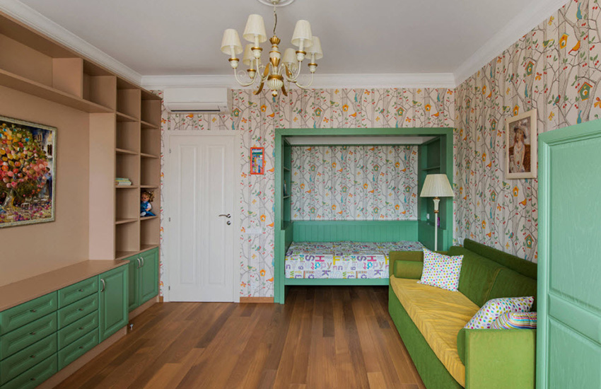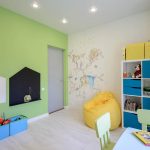 El papel pintado en la habitación de los niños debe ser brillante y original. Los colores deben atraer al niño que vive en ellos. Los tonos cálidos de verde crean una atmósfera de confort, ya que estos tonos son de origen natural.