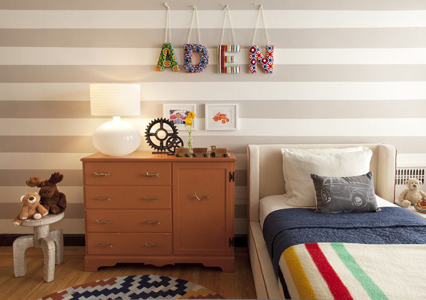El papel pintado a rayas ayudará a su hijo a calmarse después de los juegos al aire libre y a concentrarse. Si el niño es activo y desarrollado creativamente, es aconsejable dar preferencia a los tipos prácticos de papel tapiz. La superficie de dicho acabado debe ser fácil de reparar o limpiar. La mejor opción sería papel tapiz líquido y lavable.