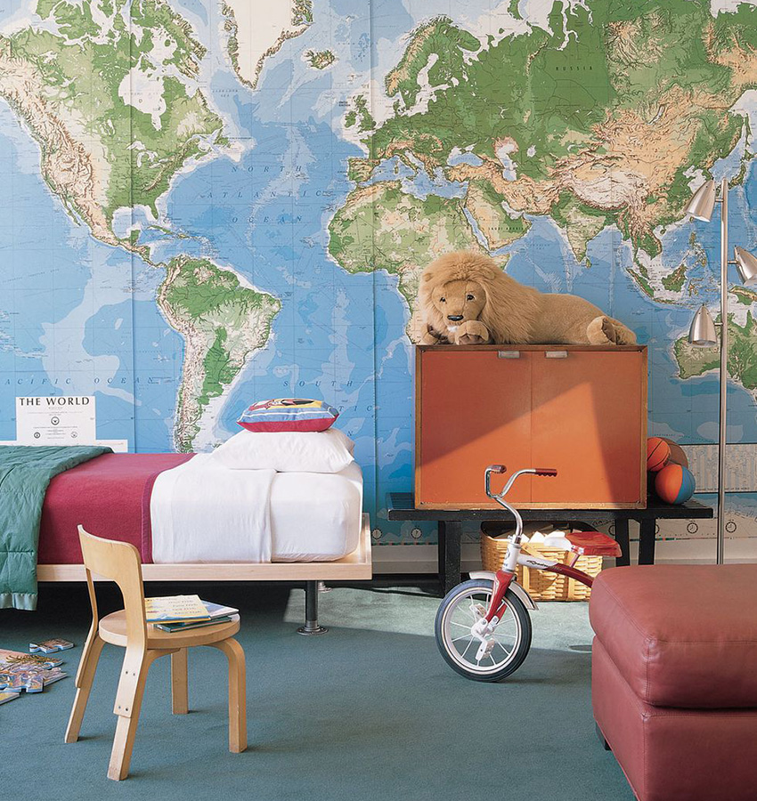 Para los niños de este grupo de edad, un mapa será un elemento decorativo útil en la pared. Le permitirá al niño evaluar la escala del mundo, así como familiarizarse más con su geografía, por ejemplo, aprender sobre la ubicación de continentes y países.