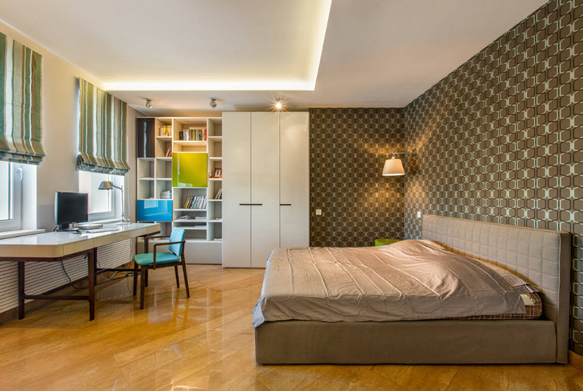 Si la habitación es bastante espaciosa y luminosa, tiene ventanas grandes, puede seleccionar un diseño de papel tapiz original para la habitación de un adolescente, por ejemplo, lienzos decorados con una impresión colorida. Si desea lograr una solución universal que seguirá siendo relevante durante varios años, es mejor dar preferencia a las abstracciones y los patrones geométricos neutros.