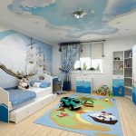 El acabado final se puede diversificar con un componente decorativo en forma de pegatinas. Pueden representar los personajes favoritos del niño. Este método se considera el más sencillo y económico. Las pegatinas te permiten apoyar casi cualquier tema en el interior de la guardería y al mismo tiempo complacer al niño. Cuando el diseño de la habitación se aburre, puede deshacerse de ellos fácilmente. Los seguidores del estilo clásico pueden usar papel tapiz en la habitación de los niños en combinación con cornisas, molduras y zócalos. Lo principal es que estos elementos tienen un color similar al acabado.