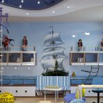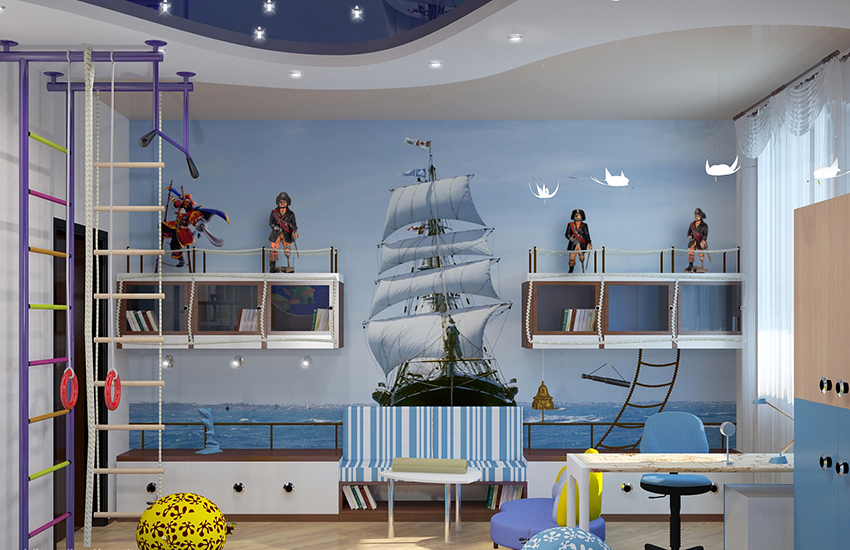A muchos escolares les gusta el tema marino. Para darle vida a un diseño de este tipo, debe atenerse a las sombras de las olas del mar y los tonos cercanos. Las sirenas no son interesantes para los niños, pero los veleros, los piratas y el mundo submarino estarán bien.
