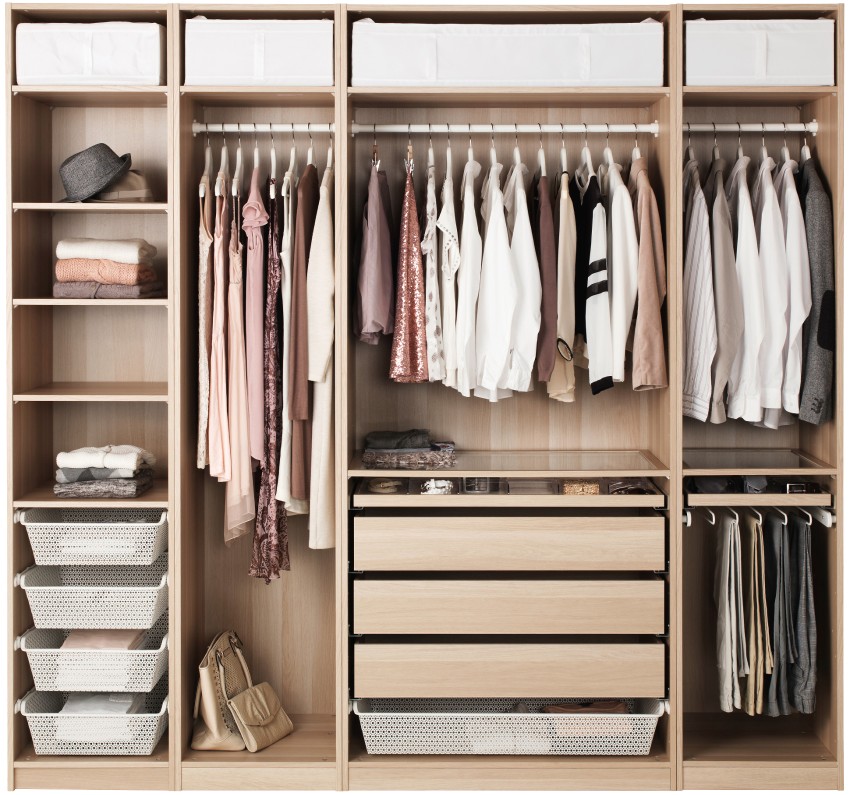 Los guardarropas Pax están diseñados de tal manera que los artículos almacenados en ellos son completamente visibles y fácilmente accesibles. Además, los clientes pueden crear de forma independiente opciones de vestuario, gracias a un programa de diseño modular especial y la posibilidad de comprar los componentes internos necesarios del vestuario. La elección de elementos y accesorios adicionales es muy diversa.