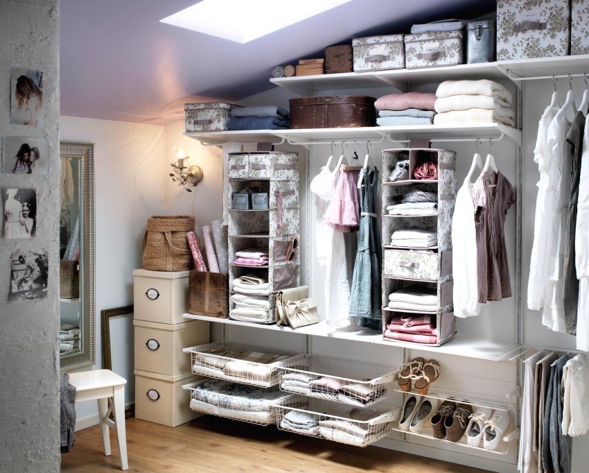 ¡Consejo útil! Al organizar un vestidor, vale la pena planificar su iluminación: las lámparas de techo dirigidas a los estantes de la estructura se consideran óptimas.