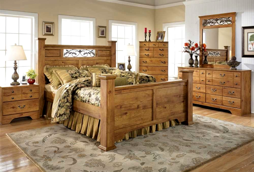 Los elementos principales de los muebles de dormitorio de estilo rústico, la cama y los tocadores, deben estar hechos de madera.