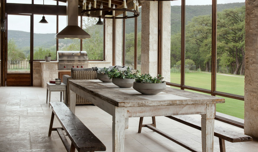 Una mesa de madera maciza debe tener una forma redonda o rectangular con patas sólidas y confiables que proporcionen estabilidad a la estructura y la capacidad de soportar cargas pesadas. Las sillas deben ser cómodas, con asiento y respaldo amplios y acolchados, sin apoyabrazos. Los bancos de mimbre parecen orgánicos.