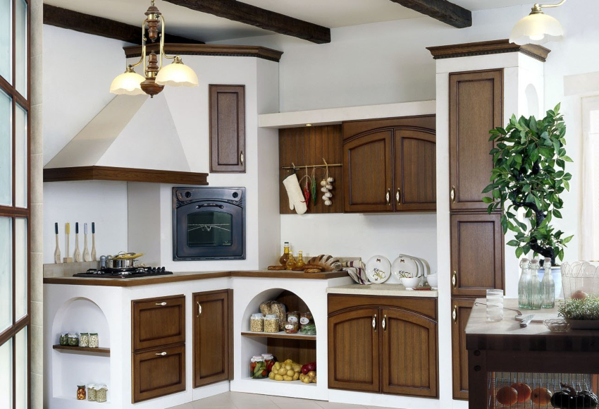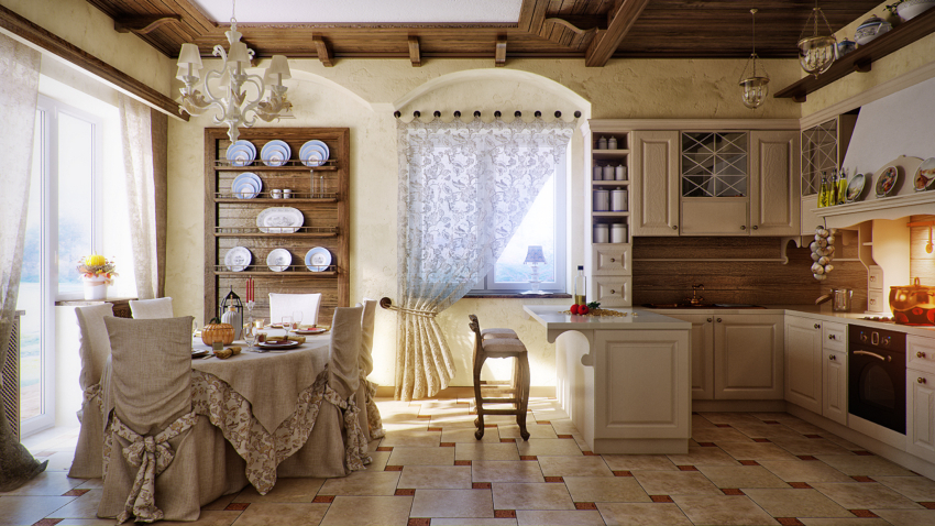 El estilo campestre es el más adecuado para la decoración de cocinas debido al deseo de naturalidad y naturalidad. Las paredes se terminan con yeso texturizado seguido de pintura o revestido con baldosas cerámicas en una paleta clara. Este último también se utiliza como pavimento. El techo está decorado con tablas o vigas de madera.