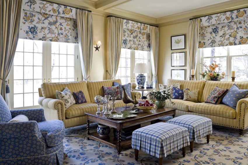 ¡Consejo útil! Al comprar textiles con un patrón, debe seleccionar las mismas composiciones para cortinas, manteles, colchas y tapicería de muebles.