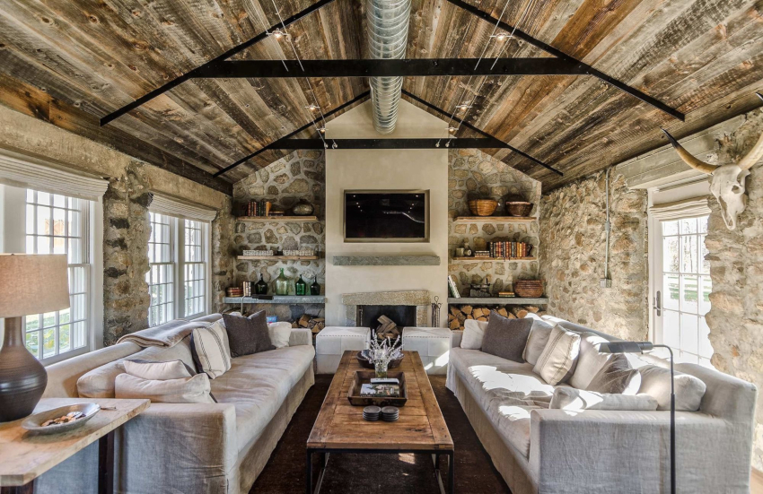 Una chimenea y un techo con vigas de madera son las principales características de la sala de estar de estilo rústico.