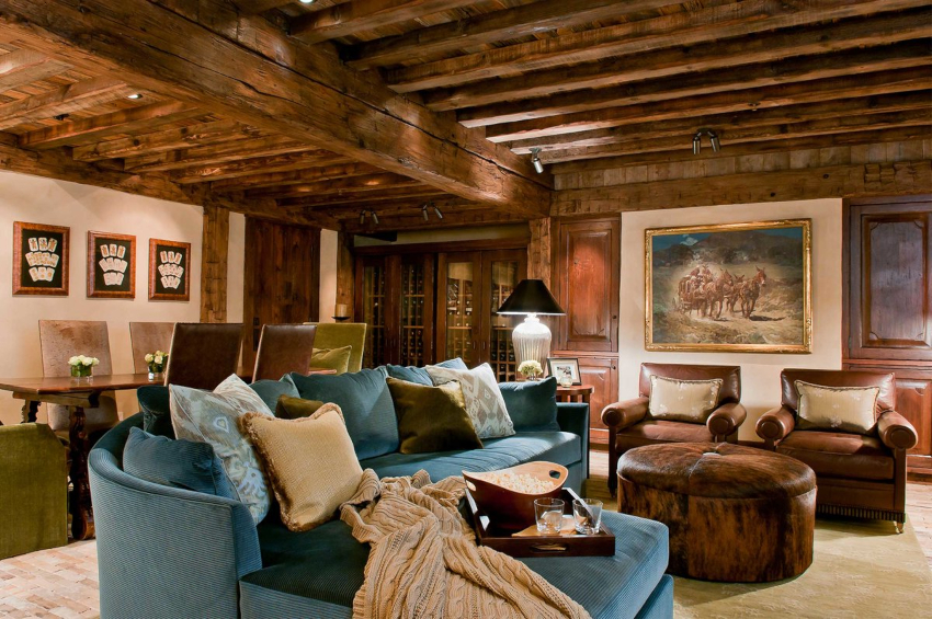 El techo está decorado con vigas de madera. El suelo se presenta con piedra, baldosas o tablones. Puede combinar revestimientos, zonificando así la habitación. Durante la renovación en estilo rústico, las paredes de la sala de estar se terminan con yeso decorativo, pintadas, pegadas con papel tapiz o revestidas con paneles de madera en colores claros. Es aconsejable resaltar una pared decorativa utilizando papel tapiz con motivos florales, ladrillos o pintura artística.