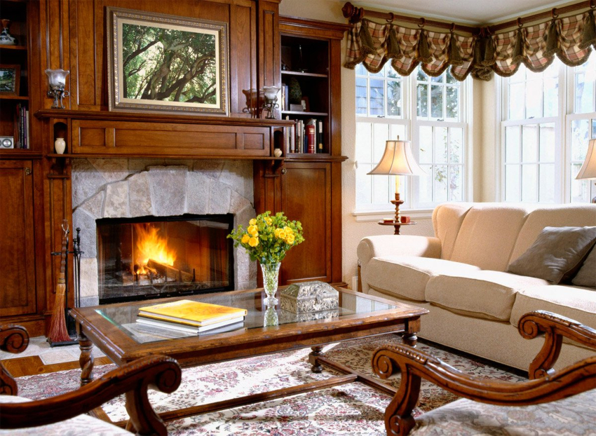 En la sala de estar, los rasgos característicos de la dirección estilística se manifiestan más activamente que en el dormitorio. Uno de los elementos principales de la estancia es la chimenea. Su entorno está decorado con azulejos o mampostería, decorado con candelabros de hierro forjado, instalaciones paisajísticas en marcos de madera y ollas para leña.