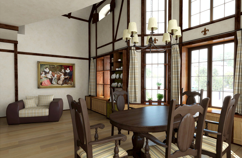 Las paredes pueden tener estantes abiertos para guardar libros y diversos accesorios. El lugar central lo ocupa una sólida mesa de comedor, decorada con un mantel de encaje.