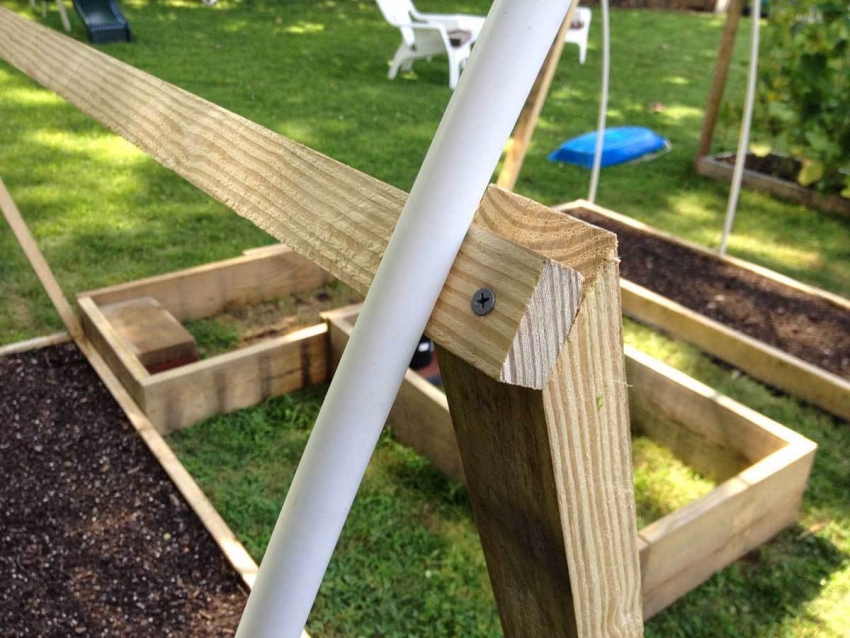 - Un tubo largo (o dos cortos, unidos entre sí) se ubica en el centro de los arcos que se colocan en la base, y se fija lo más firmemente posible con abrazaderas o cuerdas. Sobre esto, el montaje del marco puede considerarse certificado.