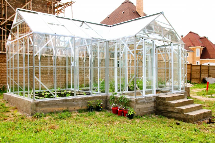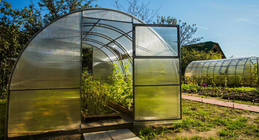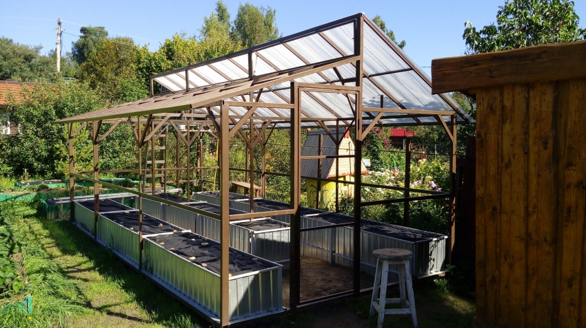 Un invernadero hecho de policarbonato y perfiles de acero es una opción de construcción económica y confiable para una cabaña de verano