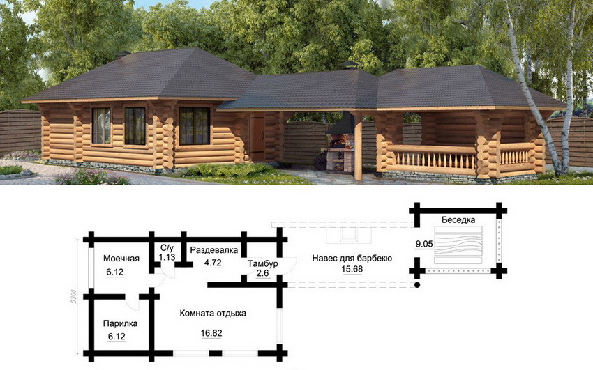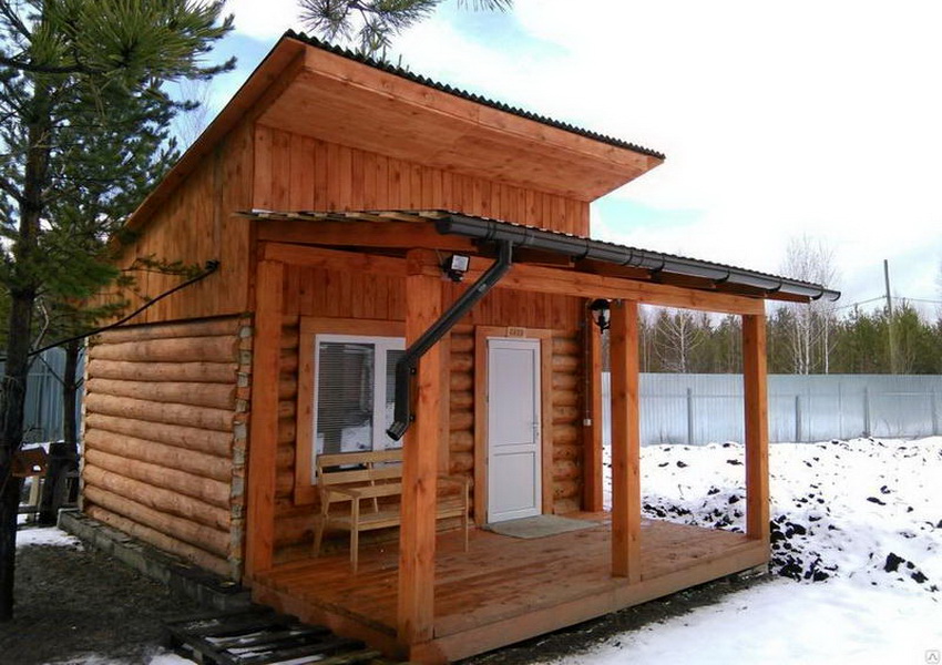 En primer lugar, se debe prestar atención a considerar las características del proyecto más popular: un baño con una glorieta debajo de un techo a dos aguas alargado. La glorieta en esta versión descansa sobre las paredes del edificio y soportes verticales. En este caso, los expertos recomiendan prestar especial atención al proceso de construcción de los cimientos, ya que es mejor utilizar bases de diferentes tipos.