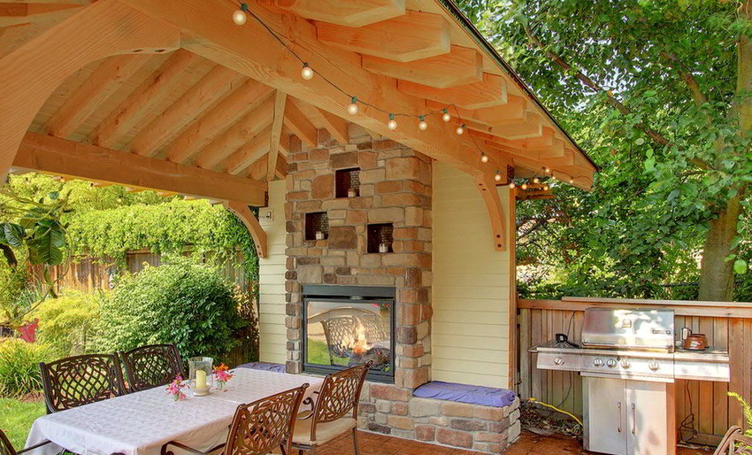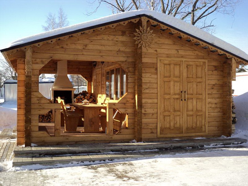 - la glorieta se puede dividir en dos zonas, cada una de las cuales puede cumplir su función. La mitad del espacio se puede usar como comedor y la otra se puede usar como pila de leña. Por supuesto, esta opción de diseño es adecuada si el área asignada para la glorieta es lo suficientemente grande;