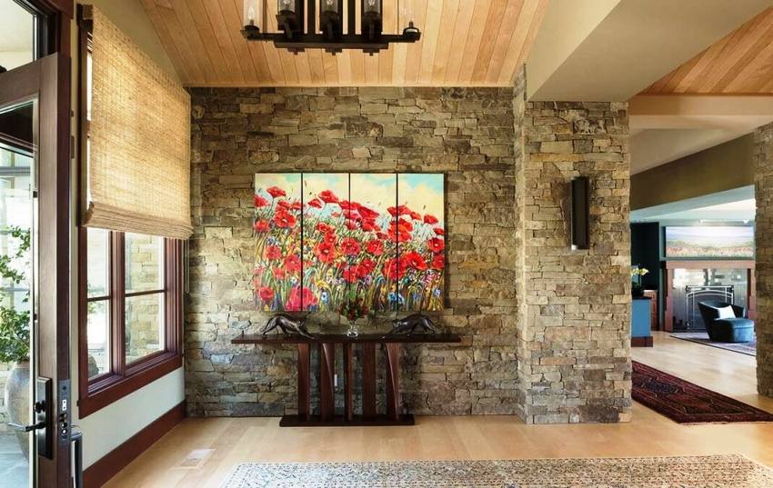 Además del revestimiento decorativo, es apropiado aplicar pintura convencional, pero esto requiere rellenar idealmente las paredes. Algunas áreas se pueden decorar con piedra decorativa, tablillas o una combinación de estos materiales. Esta opción es más adecuada para el diseño de un gran pasillo cuadrado, cuando no es necesario ahorrar espacio.