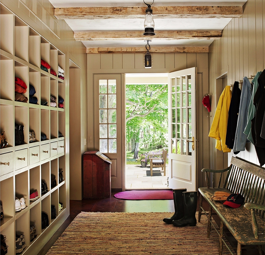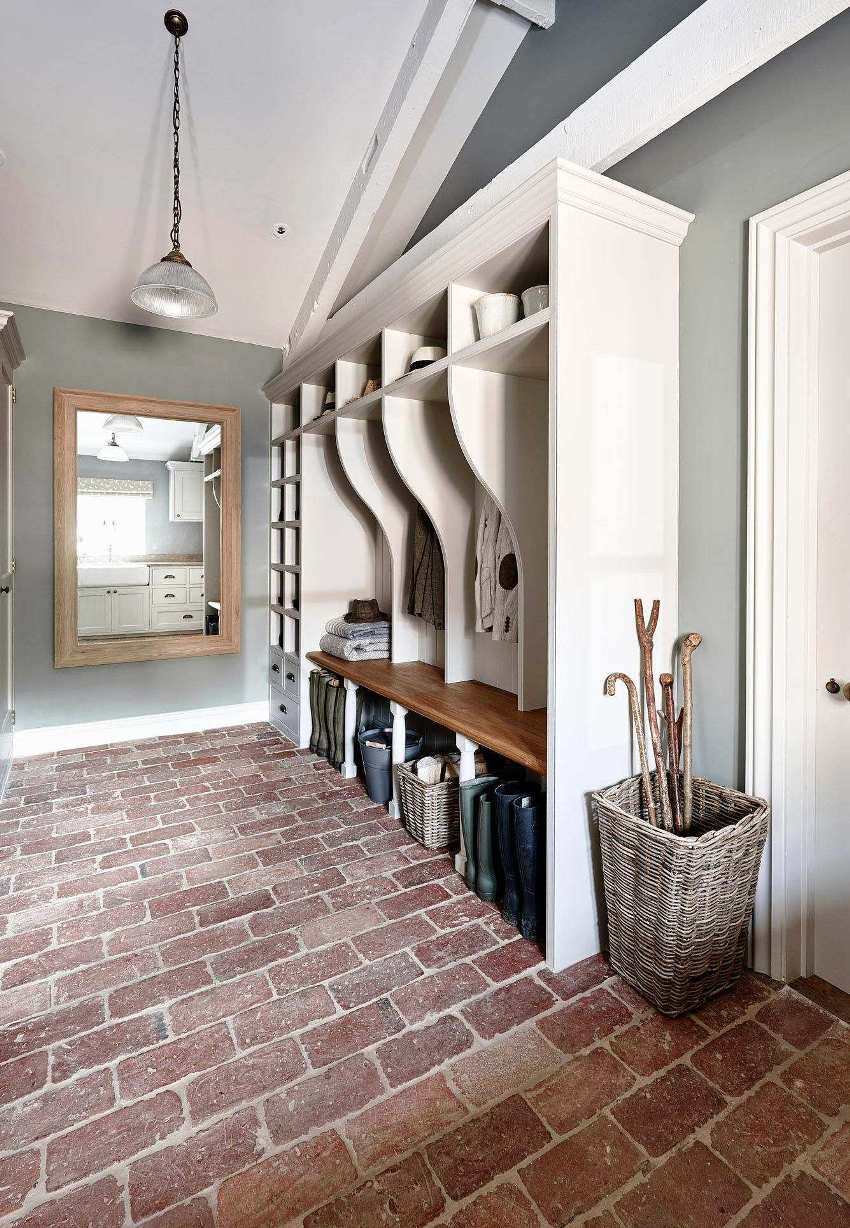 El estilo inglés requiere amplitud y techos altos. Es apropiado hacer las paredes con un patrón floral o una jaula discretos. La presencia de puertas ciegas, una enorme cómoda y una percha de hierro forjado son bienvenidas. Puedes complementar el interior con espejos o cuadros en marcos redondos u ovalados. Es mejor colocar una baldosa estampada o una tabla de parquet en el piso, que debe cubrirse con una alfombra a cuadros o simplemente oscura.