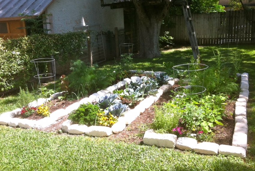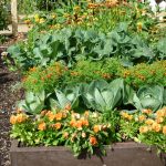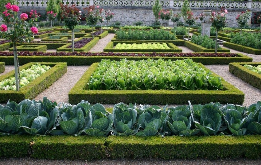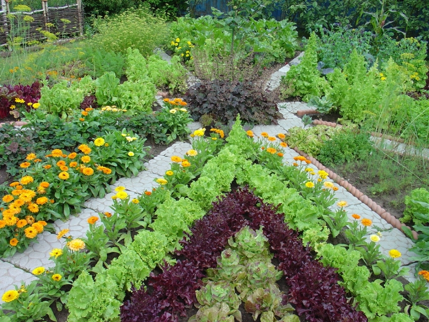 El diseño de las camas puede ser muy diverso, todo depende de la imaginación. Para diversificar la apariencia de las plantaciones, puede agregar flores, por ejemplo, caléndulas, a las verduras. Sus flores, que son de color naranja brillante, diluirán la aburrida vegetación y protegerán las plantas de los pulgones.
