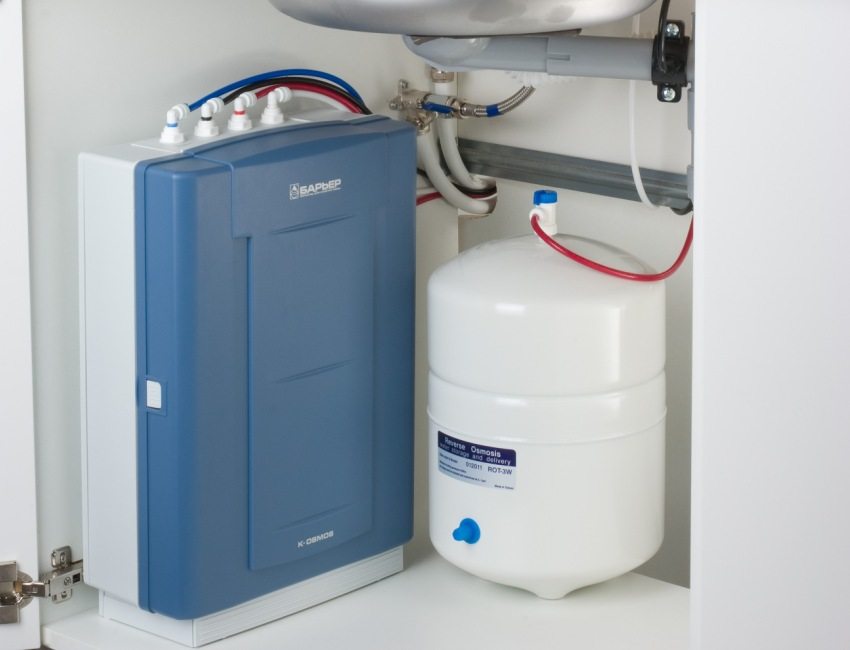 Las ventajas del sistema son el mayor grado de purificación, un suministro de agua de 10 litros y un bajo costo de agua tratada. El conjunto incluye cartuchos de purificación previa, membrana de ósmosis inversa, filtro de purificación posterior, mangueras de conexión. Los sistemas de ósmosis inversa se distinguen por su elevado precio y su gran eficacia de limpieza.