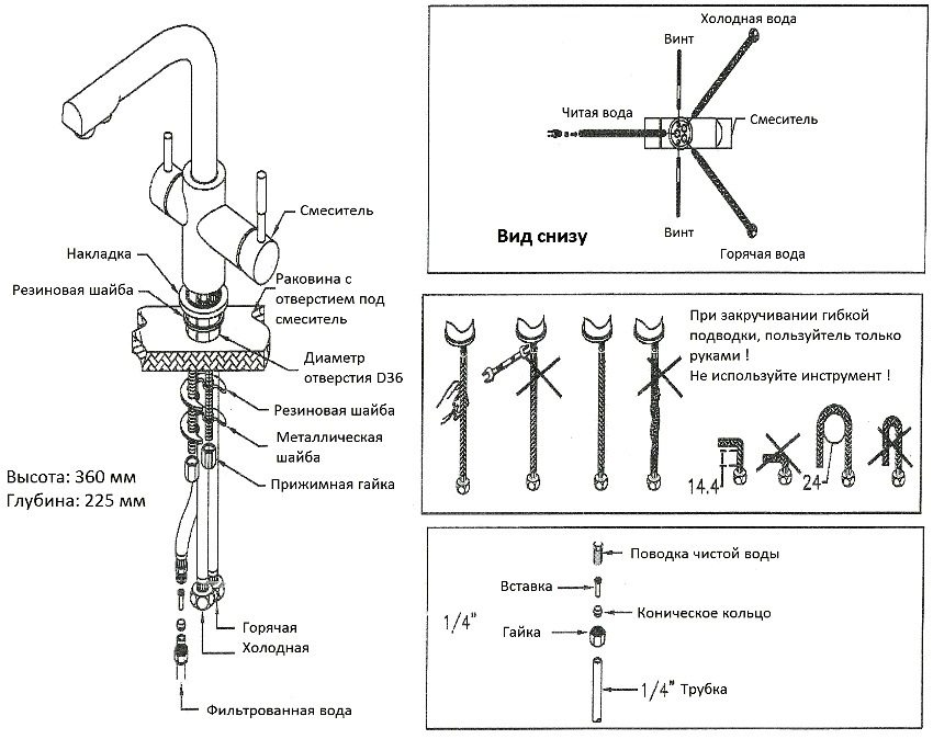 El diseño de un grifo de cocina con grifo para beber es diferente al habitual. mezcladores porque está equipado con un canal independiente para el suministro de agua después de pasar por el filtro.En la boquilla del grifo, además del orificio para el agua sanitaria, hay un orificio para el agua potable. La regulación del suministro de agua depurada se realiza mediante una válvula separada instalada en el cuerpo común del mezclador. Por lo tanto, girando una palanca (se suministra agua corriente del grifo, girando la otra palanca) se suministra agua potable.