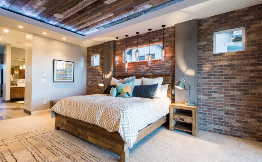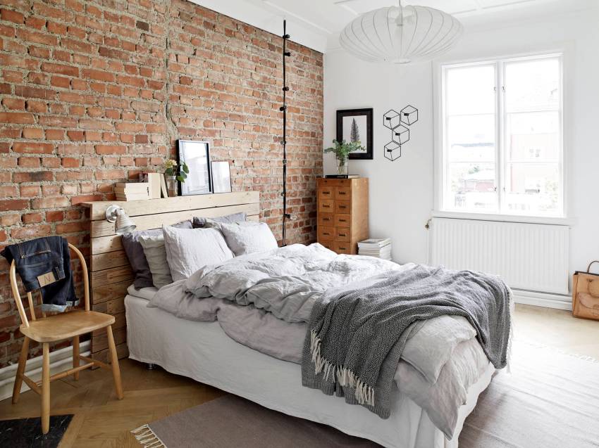 El método de acentuar una pared con una pared de ladrillo blanco también se puede utilizar en el dormitorio. Estos papeles pintados se pegan a la superficie detrás de la cabecera. Se permite terminar en forma de imitación de ladrillo desde el lado opuesto al lugar para dormir o junto a la ventana. Las cortinas translúcidas, una piel en el piso o una alfombra cálida, las almohadas brillantes en la cama son adecuadas como complemento decorativo.