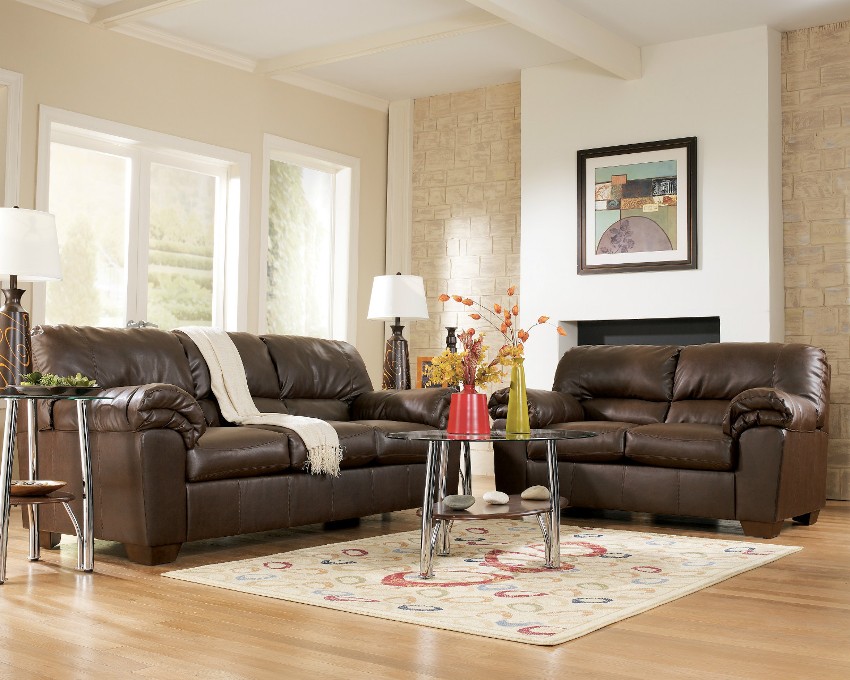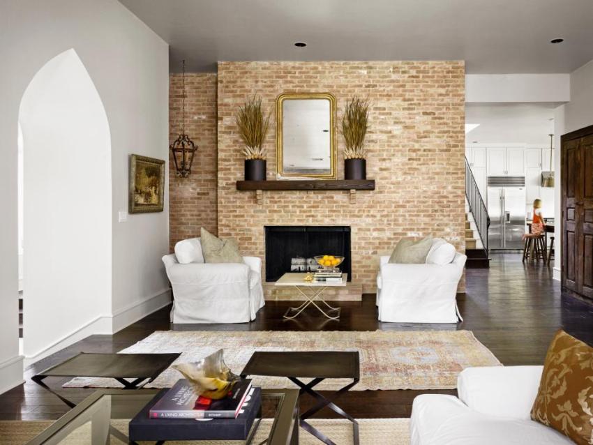 La combinación más orgánica se obtiene decorando la sala de estar con una falsa chimenea o salientes de pared en forma de columnas con paredes de ladrillo. Al mismo tiempo, no se recomienda decorar con papel tapiz alrededor de una chimenea real, ya que este material no es confiable en términos de seguridad contra incendios y rápidamente se vuelve inutilizable debido a los efectos negativos de las altas temperaturas.