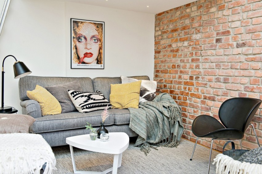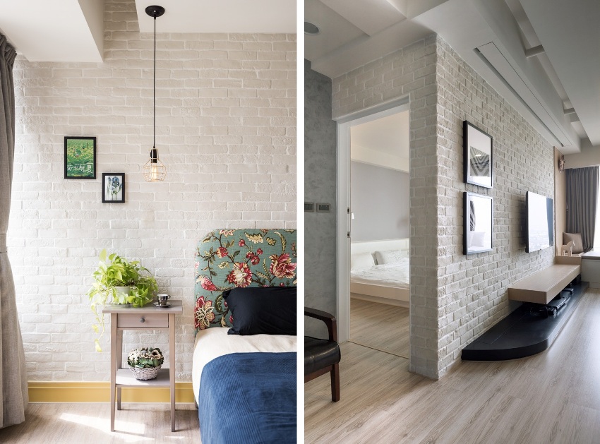 El uso de papel tapiz de ladrillo blanco en el interior de la sala de estar y el dormitorio.