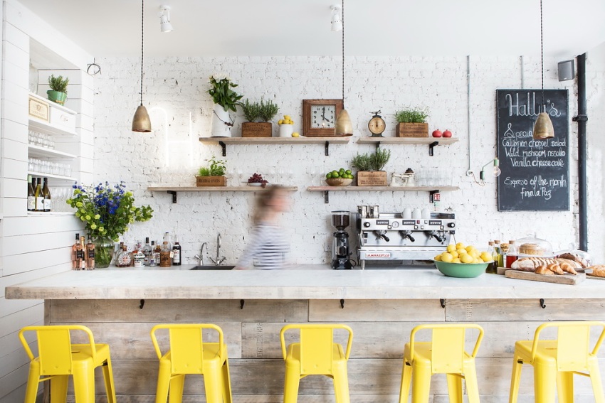 En estos casos, este diseño es ideal para amueblar el interior. La decoración en sí no solo se ve moderna, sino que también le permite hacer que el ambiente de una institución pública sea acogedor y confortable.