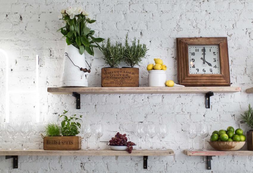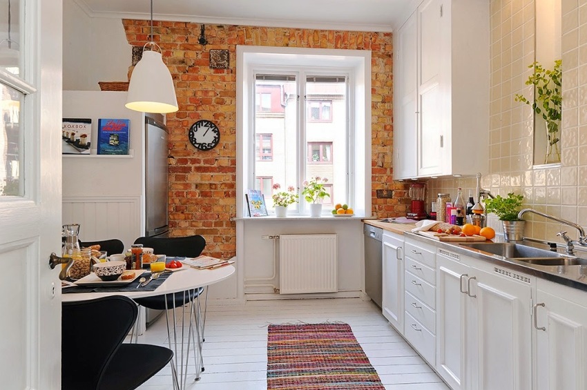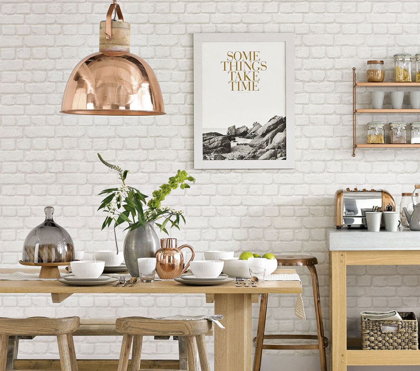 En la cocina, una imitación de ladrillo blanco decorativo en el papel tapiz se verá genial en combinación con los siguientes materiales: