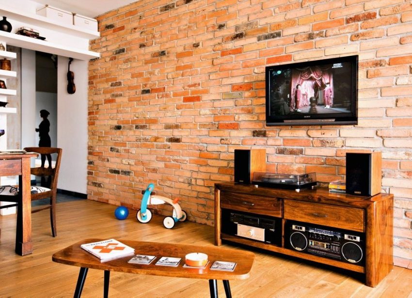Si la habitación tiene chimenea o estufa, debe cuidar el acabado adecuado del espacio a su alrededor. Los diseñadores no recomiendan cubrir completamente las paredes con ladrillos de imitación para la decoración de interiores; es mejor hacerlo alrededor del hogar o en un área pequeña.