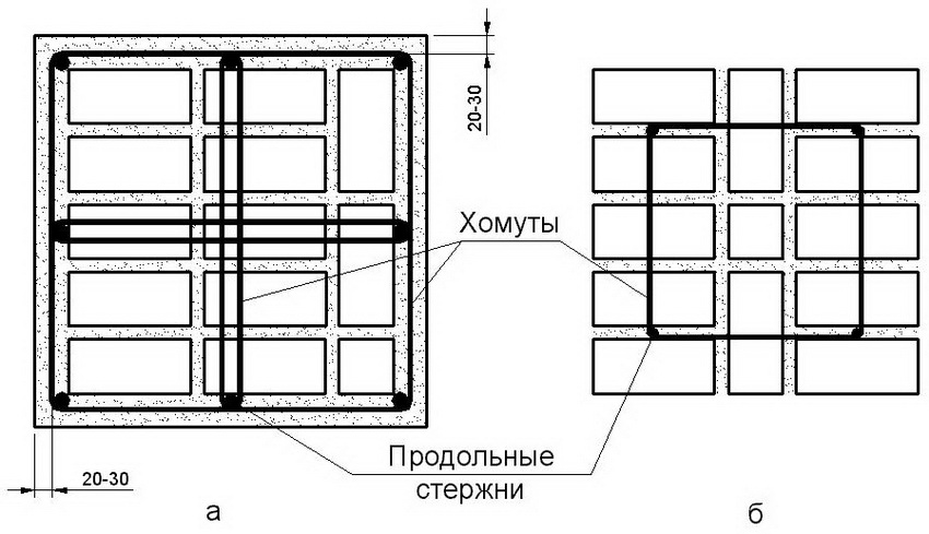 Refuerzo longitudinal de mampostería: a - disposición externa de varillas, b - disposición interna de varillas