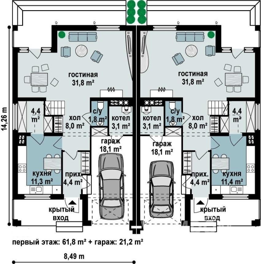 ¡Importante! La parcela de vivienda del dúplex se puede dividir en dos áreas del mismo tamaño, separadas entre sí por una valla, o ser común para ambas familias.
