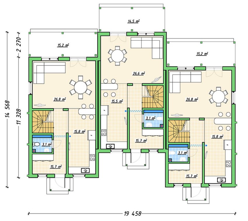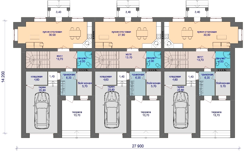 ¡Importante! Los triplex de dos pisos con una entrada le permiten ahorrar espacio de tierra libre en un 40-45%, lo que contribuye a la creación de un territorio contiguo general.