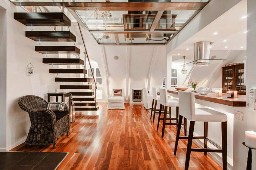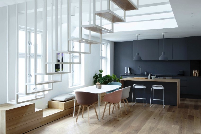 La escalera de la casa adosada juega un papel importante. Su tipo y diseño pueden ser clave a la hora de elegir el estilo del interior de toda la casa. Puede ser tan discreto como sea posible y destacar del espacio general.