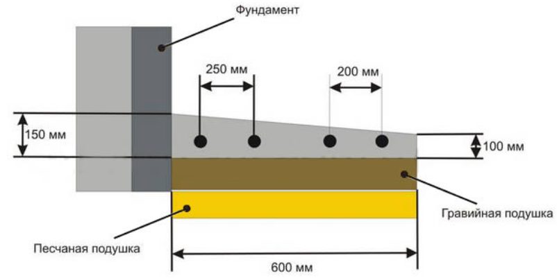 El primer paso es seleccionar el ancho de banda. Según la normativa, el valor mínimo es de 0,8 m. Las dimensiones máximas no están reguladas, pero en promedio oscilan entre 1 ma 2,5 m. También se tiene en cuenta el momento en que el área ciega alrededor de la casa sirve como sendero para caminar. Cuanto más ancho sea, más fácil será caminar sobre él. Y lo más importante, menor es la probabilidad de socavar y deformar la base. Y, sin embargo, para que la desviación del agua sea eficaz, la franja de hormigón debe extenderse más allá de los límites de los aleros del techo unos 30 cm.