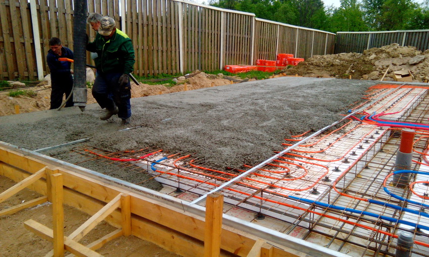 Para una losa de hormigón, se cava una depresión de 50 cm alrededor del perímetro del edificio, luego se vierte una mezcla de arena y grava 30 cm y se coloca la impermeabilización. El vertido de hormigón con refuerzo adicional se realiza en la parte superior. La cinta de hormigón sobresale 15 cm del nivel del suelo y se coloca un zócalo en la superficie de la base.