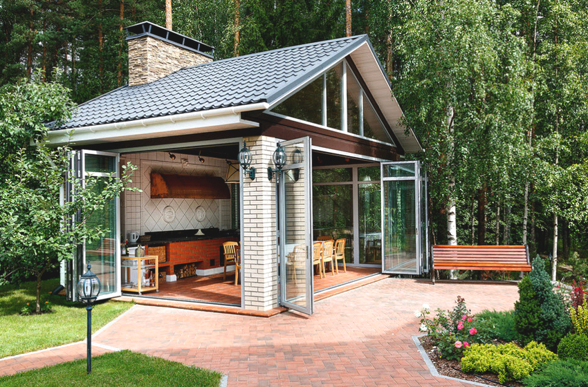 - Los hornos de barbacoa abiertos, las barbacoas en una glorieta de ladrillos le permitirán no solo reunirse, sino también disfrutar de una barbacoa recién preparada en cualquier época del año. La condición principal en este caso es ventilar adecuadamente. Muy a menudo, las estructuras están acristaladas.