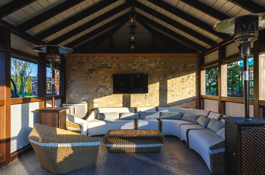 - Un lugar para reuniones y reuniones de invitados. Para mayor comodidad, estos cenadores están equipados con cocinas de verano completas. Una buena opción es instalar un horno de ladrillos en el mirador, que llenará de calidez y comodidad la habitación en caso de mal tiempo.