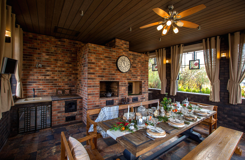 - Cenadores cerrados con chimenea. Para erigir tales estructuras, debe tener una experiencia laboral promedio, porque no es fácil colocar una chimenea de ladrillo con sus propias manos. Para que la chimenea no fume y la habitación se caliente, debe seguir las reglas de mampostería. Se recomienda preliminarmente estudiar los métodos básicos para crear chimeneas.