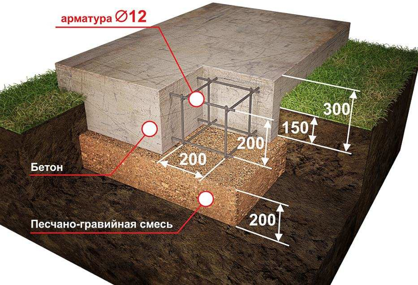 Si se requiere una base sólida reforzada, el trabajo comienza con la creación de un foso, donde se coloca el encofrado de madera y se instala el refuerzo. La etapa final es el vertido del hormigón. Al construir una base de losa, a menudo se descuida el piso.