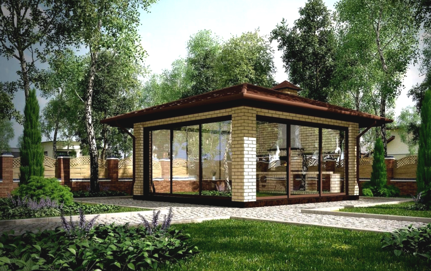El diseño de una glorieta de ladrillo cerrada se considera el más beneficioso en todos los aspectos. Esto se debe al hecho de que en el verano el edificio permanece fresco y en el frío se puede calentar con una estufa de leña, chimenea o calentadores eléctricos.